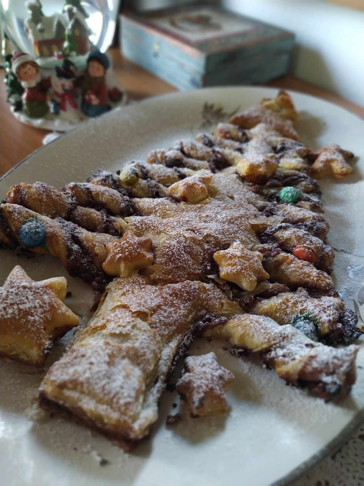 Απλώνουμε τη μερέντα πάνω στο ένα φύλλο σφολιάτας (προσοχή να μη βάλουμε μεγάλη ποσότητα μερέντας γιατί θα χυθεί καθώς ψήνεται)και σκεπάζουμε από πάνω με το δεύτερο. Σχηματίσουμε ένα δέντρο με ένα μαχαίρι χωρίς δοντάκια , το κόβουμε γύρω γύρω ,στριφογυρίζουμε τις άκρες ώστε να σχηματιστούν τα κλαδιά, και από τη σφολιάτα που περίσσεψε κόβουμε με κουπάτ χριστουγεννιάτικα σχέδια ,τα τοποθετούμε στο ταψί, αλείφουμε με το αβγό και ψήνουμε σε προθερμασμένο φούρνο στους 150 βαθμούς μέχρι να ροδίσουν. Το δεντράκι μας είναι έτοιμο και νοστιμότατο!